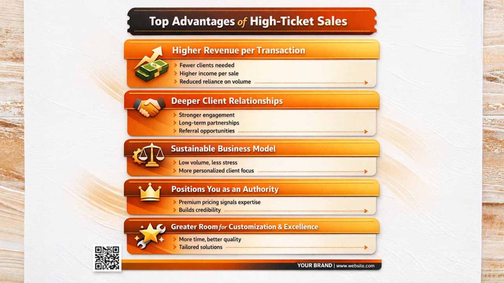 Let’s see the advantages of high-ticket sales and how they help businesses generate higher revenue with fewer clients. These benefits highlight why many businesses shift toward premium, value-driven selling: